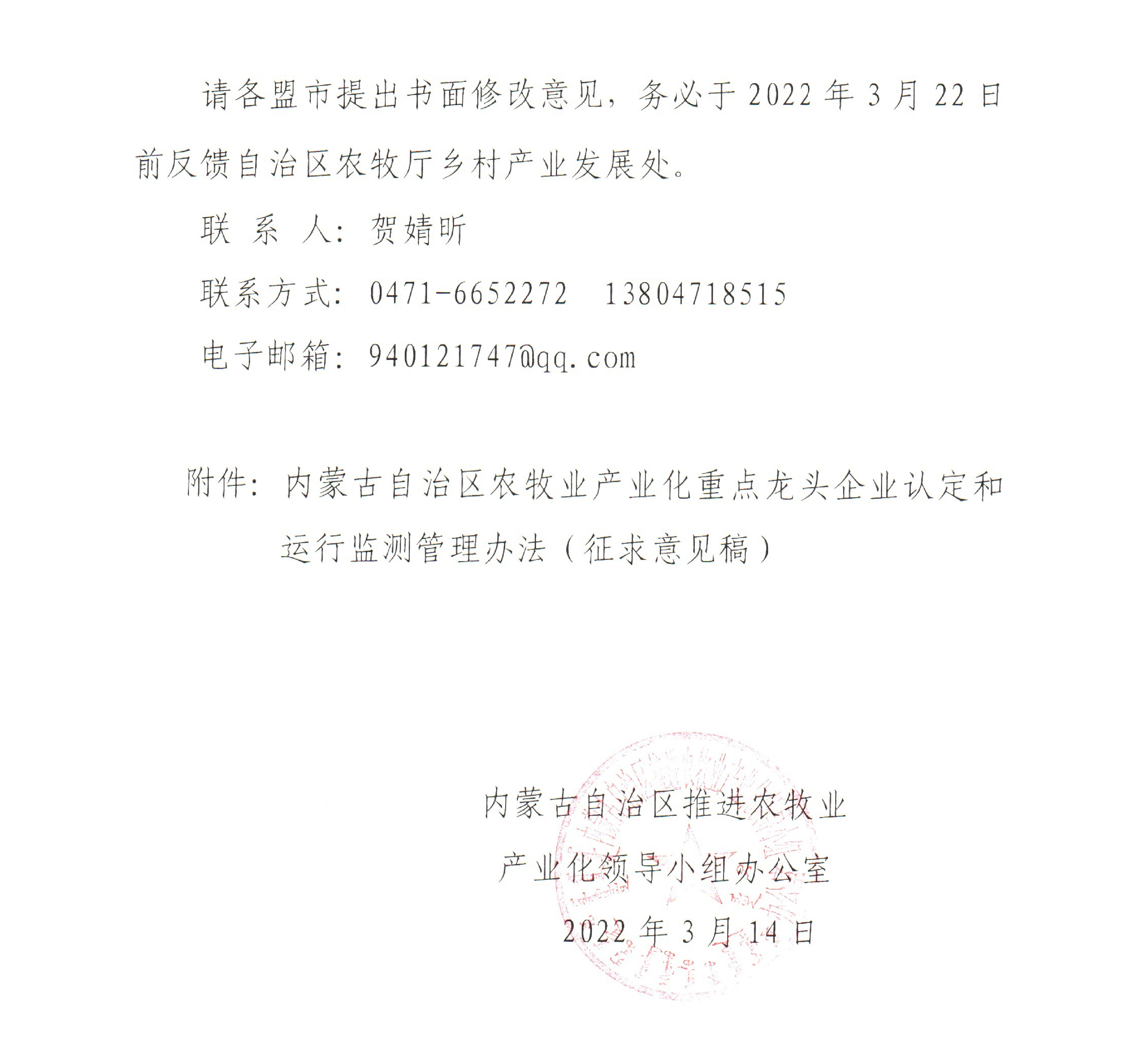 標(biāo)題:關(guān)于征求修訂《內(nèi)蒙古自治區(qū)農(nóng)牧業(yè)產(chǎn)業(yè)化重點龍頭企業(yè)認(rèn)定和運行監(jiān)測管理辦法(征求意見稿)》修改意見的函
