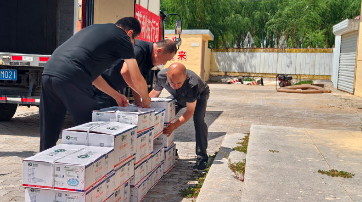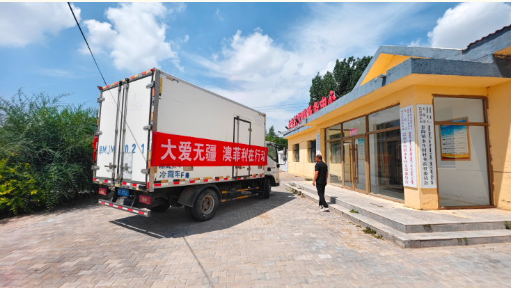 捐贈現(xiàn)場,一輛懸掛“大愛無疆 澳菲利在行動”紅色條幅的冷鏈車緩緩駛入套海鎮(zhèn)永生村村委會,車剛停穩(wěn),工作人員迅速將一箱箱羊肉產(chǎn)品搬下車,整齊碼放在村委會門口,現(xiàn)場暖意涌動。