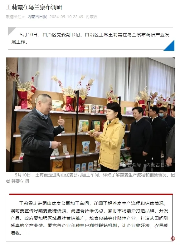 內(nèi)蒙古自治區(qū)主席王莉霞在烏蘭察布市調(diào)研,深入陰山優(yōu)麥了解燕麥產(chǎn)業(yè)發(fā)展情況
